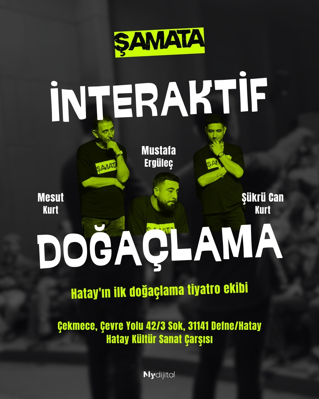 İddia Ediyoruz: Çok Güleceksiniz. Hatay’ın İlk Doğaçlama Tiyatrosu Şamata ile Eğlence Dorukta. Bu oyunu siz yazıyor, siz şekillendiriyorsunuz. Sanatçılarımız ise kahkaha ve eğlence dolu saatler için sizinle birlikte bu oyunu oynuyor. Eğlenceli saatlere var mısın?